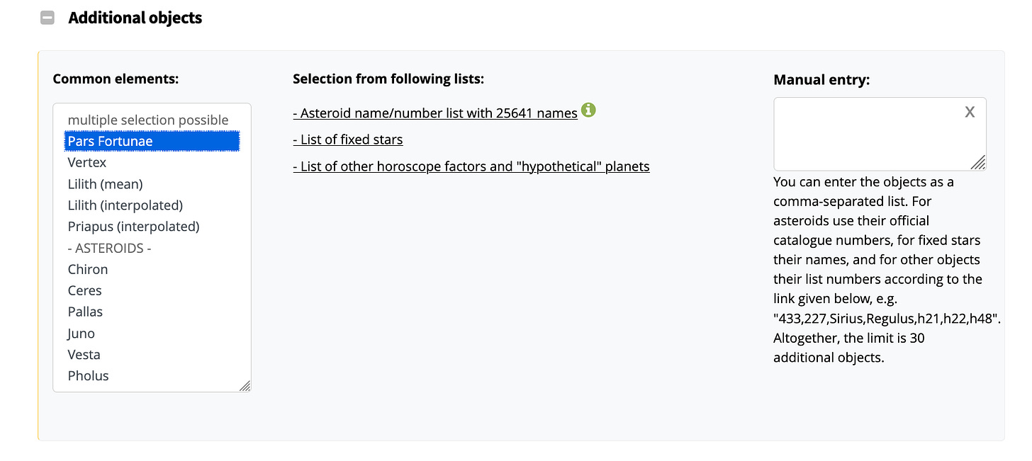 From there, you’ll input your birth information (and yes, birth time matters if you know it!), and scroll to the bottom where it says “Additional Objects.”