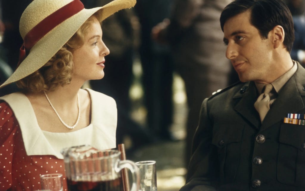 Keaton and Pacino met on the set of The Godfather in the early 1970s. A quirky California girl who was both dreamer and pragmatic, collides with a brooding New Yorker still climbing toward stardom. Their chemistry was instant but volatile, and their relationship unfolded in fits and starts across the filming of the trilogy.