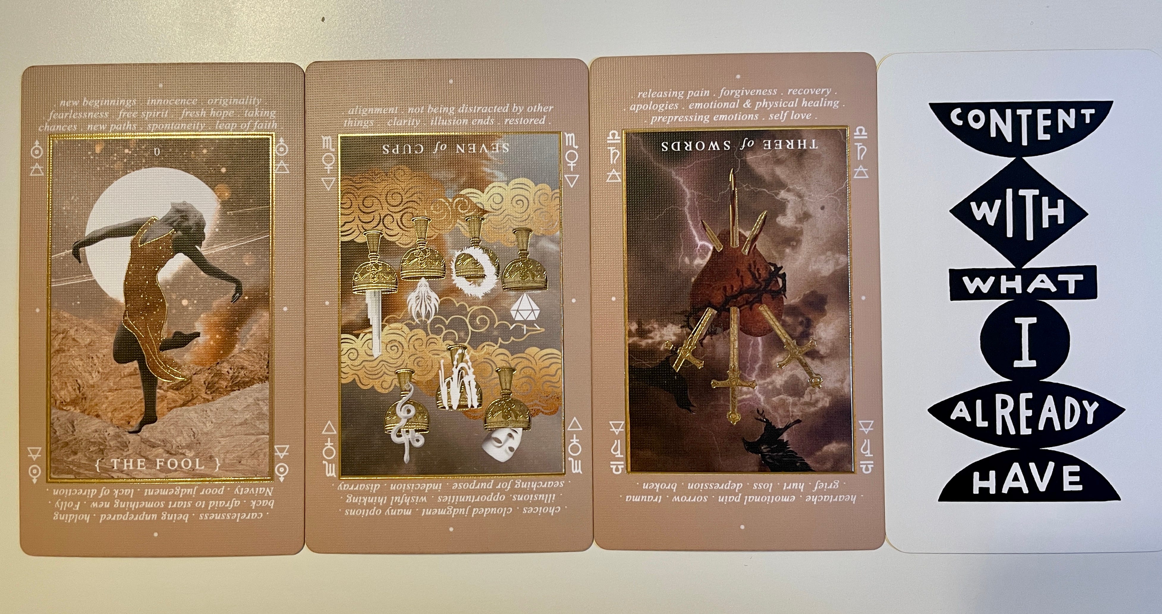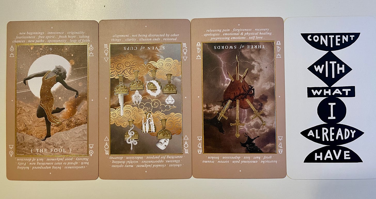 With the Seven of Cups in reverse with the Three of Swords in reverse, you’re seeing how you were playing into an illusion that was fed by pain from past relationships.